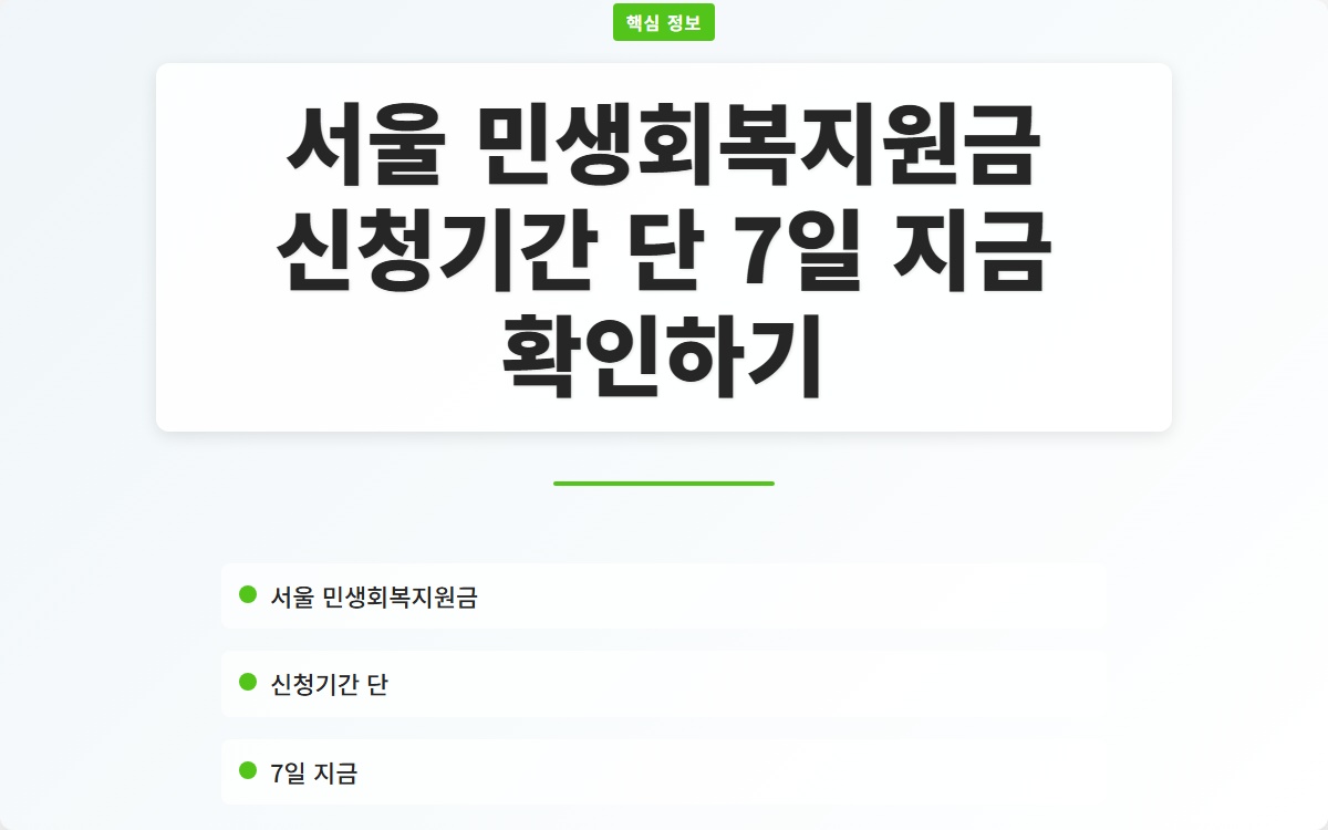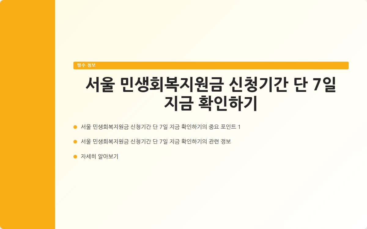 서울 민생회복지원금 신청기간은 2025년 7월 21일부터 9월 12일까지로 정해져 있습니다. 이 기회를 놓치지 않기 위해 미리 준비하고, 올바른 방법으로 신청하세요. 제대로 된 정보로 준비하면 더 큰 혜택을 누릴 수 있습니다.