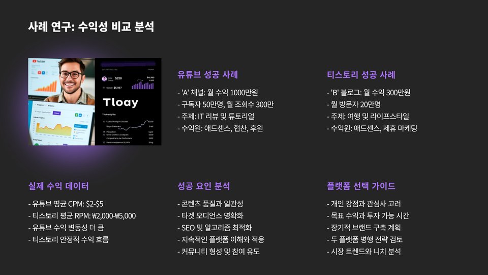마지막으로, 각 플랫폼의 트래픽에 따라 수익이 크게 달라질 수 있습니다. 유튜브는 바이럴 효과로 인해 단기간에 높은 트래픽을 얻을 수 있지만, 티스토리는 꾸준한 방문자 유치가 필요합니다.