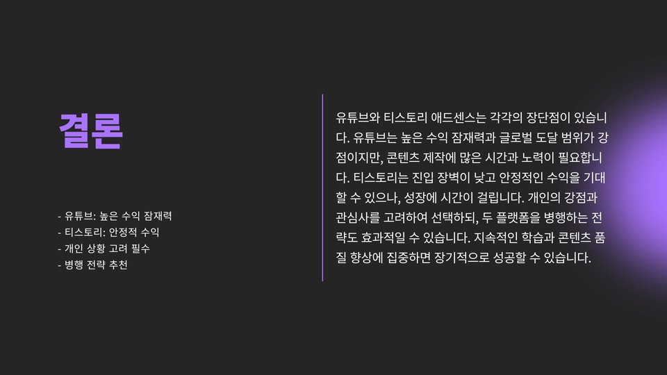 결론적으로, 유튜브 애드센스와 티스토리 애드센스 각각의 장단점이 있습니다. 유튜브는 빠른 수익 창출이 가능하고, 다양한 광고 형식을 통해 높은 수익을 올릴 수 있는 잠재력이 있습니다. 하지만, 콘텐츠 제작의 경쟁이 치열하므로 독창성이 필요합니다.