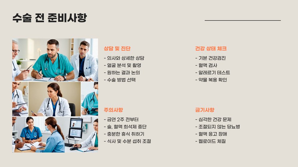 수술일이 다가오면, 음식 섭취 제한이나 금주와 같은 특정 지침을 따라야 하며, 수술 당일에는 편안한 복장을 착용하고 병원에 방문해야 합니다. 이러한 준비가 이마거상의 성공적인 결과를 가져오는 데 중요한 요소가 됩니다.
