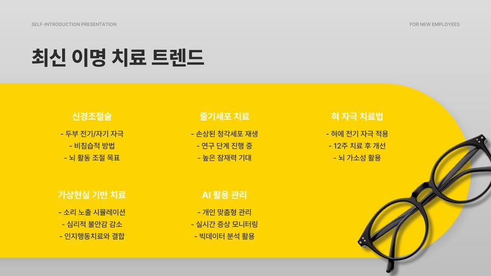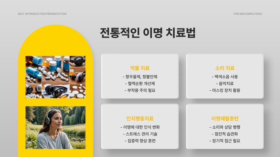 - 이명은 다양한 원인으로 발생하며, 개인 맞춤형 치료가 필요하다.