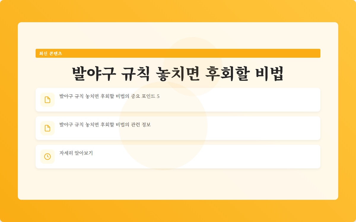 발야구는 팀워크와 협력의 상징입니다. 하지만 규칙을 잘 모르고 진행하다 보면 오해와 실수를 초래하기 쉽습니다. 이 글을 통해 발야구 규칙을 철저히 이해하고, 즐거운 경기를 만들어 가는 데 많은 도움을 받을 수 있습니다.