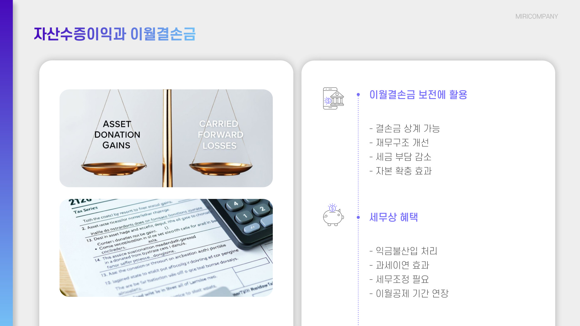 - 세무 계획을 통해 자산수증이익에 대한 세금을 합법적으로 줄일 수 있다.